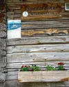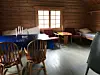 Koia har enkelt kjøkkenutsyr, gassbluss med 3 flammer, spisebord med tilhørende stoler/krakker i en liten sofakrok.